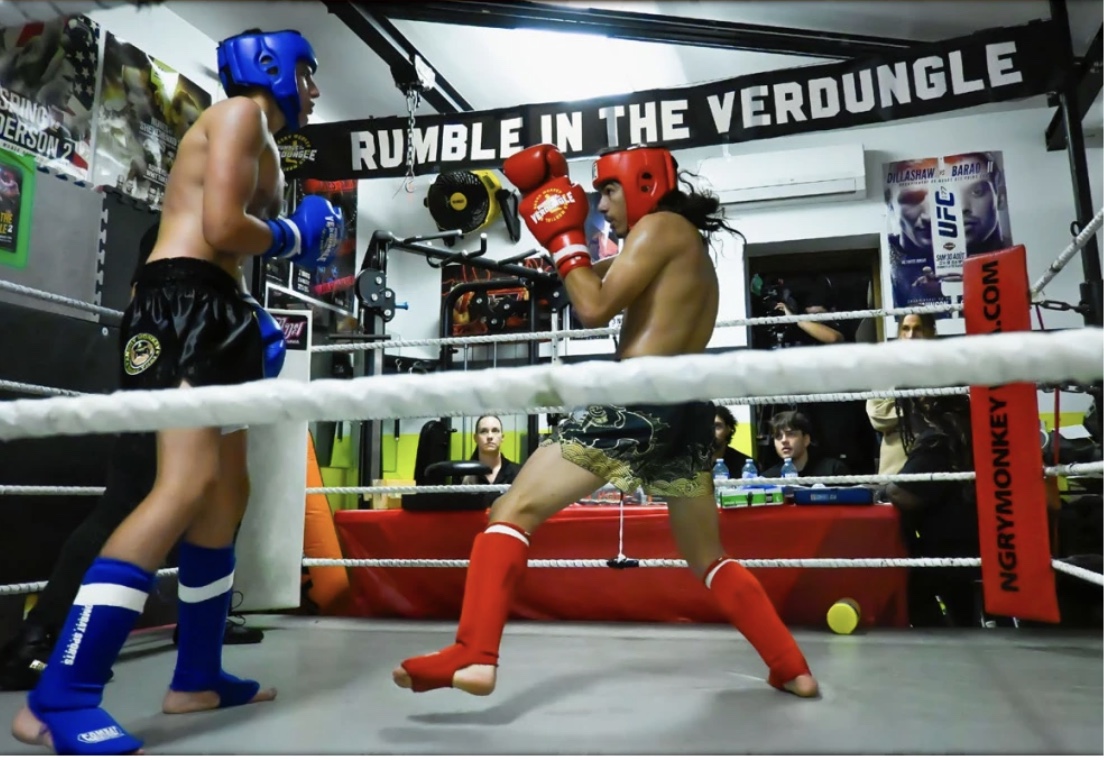 Il est un peu plus de 18h ce jeudi soir et les coups de pieds et de poings sur le cuir retentissent dans la rue de Verdun. On entend aussi une enceinte cracher un son d’AC/DC. En passant les portes de la salle Angry Monkey, il fait chaud. Un entraînement de Muay Thai (art martial traditionnel thaïlandais) vient de commencer. Dans cette discipline, les combattants peuvent frapper avec leurs poings, pieds, coudes et genoux.
