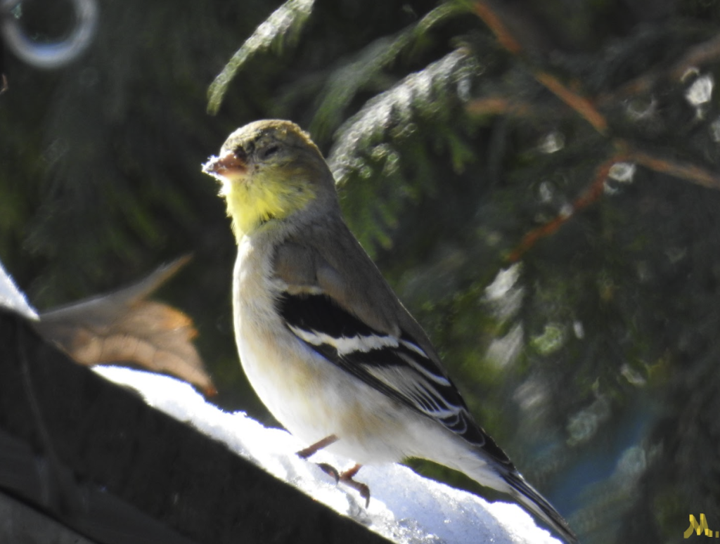 En image, un beau chardonneret jaune mâle s’est posé sur notre cabanon de la cour arrière. Encore le bec un peu enneigé, Monsieur Chardonneret jaune arborera très bientôt ses couleurs nuptiales. Sa livrée sera alors d’un jaune éclatant muni d’un toupet noir et de ses deux bandes alaires jaune pâles sur ses rémiges noires.