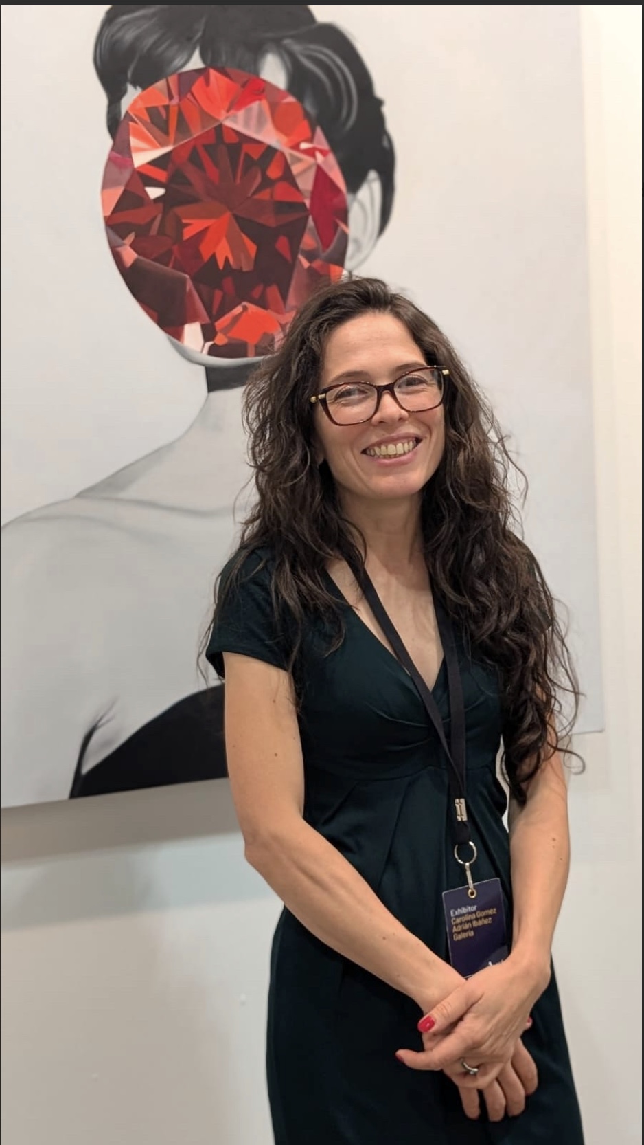Artiste plasticienne et créatrice de bijoux, elle a participé avec succès à la foire avec une proposition alliant beauté, critique et provocation. Représentée par la galerie Adrián Ibáñez, la créatrice a présenté une série d’huiles sur toile — dont les formats vont de 60 cm à 1,3 mètre de hauteur — qui attirent l’attention au premier regard : des images en noir et blanc de certaines des femmes les plus emblématiques de la culture pop. Cependant, leurs visages sont recouverts de diamants, d’émeraudes et de rubis, qui fonctionnent à la fois comme des symboles de luxe et de désir, et comme des métaphores de dissimulation.