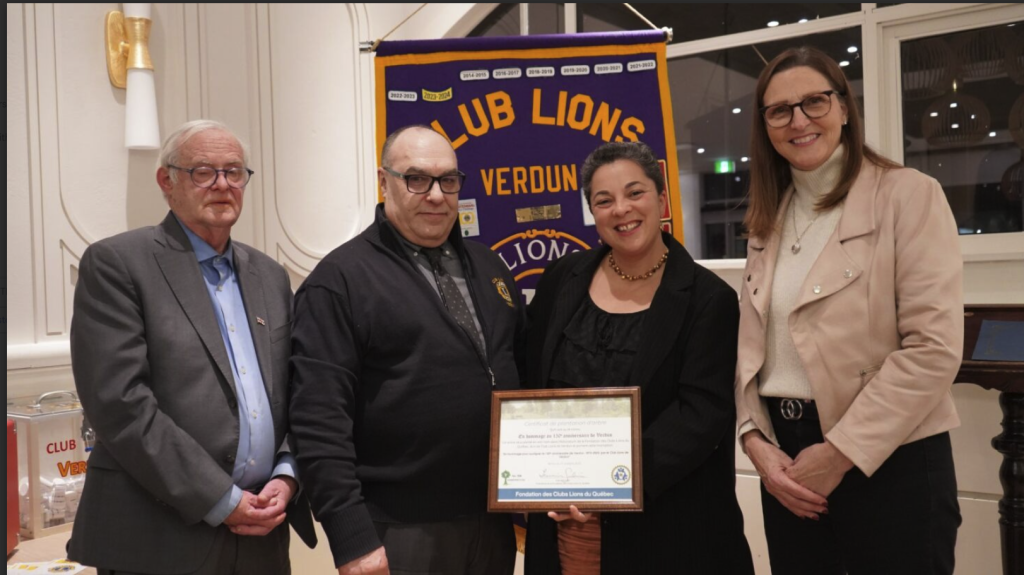 Le président du Club, Daniel Thériault, a profité du passage de la mairesse pour souligner le 150e anniversaire de l’arrondissement en remettant à Mme Beauregard et aux élus présents, soit les conseillers André Julien et Michèle Tremblay, un certificat attestant la plantation d’un arbre en l’honneur de Verdun à l’arboretum des Clubs Lions du Québec, situé à St-Rémi. Aussi,  le Club Lions a fait un don de 1 000$ au camp Carawanis, un camp spécialisé qui accueille des enfants souffrant de diabète.