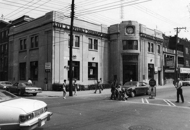 Notre photo du milieu des années 1970 montre la Banque d’Épargne, aussi identifiée comme la City & District Saving Bank. Elle était logée dans un bâtiment datant du début des années 1930. On peut remarquer sur la façade l’année de construction (1931) inscrite en chiffres romains.