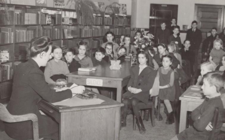 La bibliothécaire adjointe raconte une histoire aux jeunes — Décembre 1945
