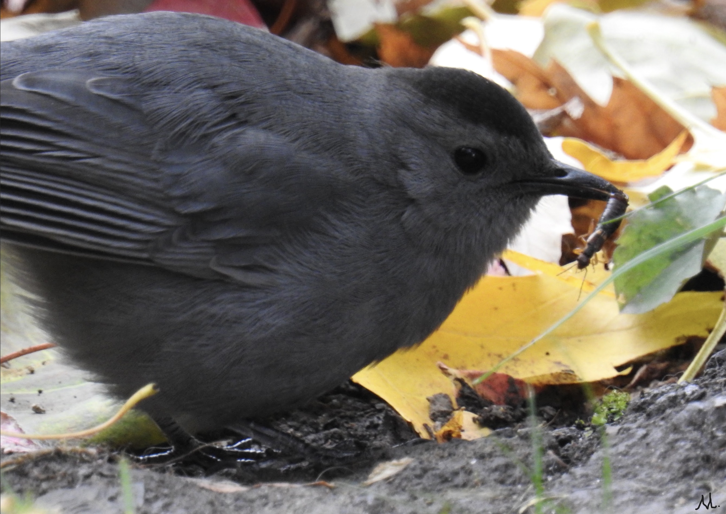 La livrée du moqueur chat est gris ardoise, sa queue est noire ainsi que ses pattes et il possède une calotte noire, aucune différence chez le mâle ou la femelle. Oh ! j’oubliais, son bec aussi est noir. Le moqueur pèse environ 37 grammes, il mesure 21 centimètres et son espérance de vie est d’environ 11 ans. Le nid du moqueur chat est souvent l’hôte de parasite de couvée, la plupart du temps, du vacher à tête brune. Cette dernière dépose un de ses œufs dans le nid voisin, pour ne pas à avoir à s’en occuper ! Mais le moqueur chat, comme le merle d’Amérique, rejette les œufs déposés. Il est venu brièvement, il est reparti, cette fois pour le grand périple migratoire. En image, moqueur chat et son perce-oreille au bec.