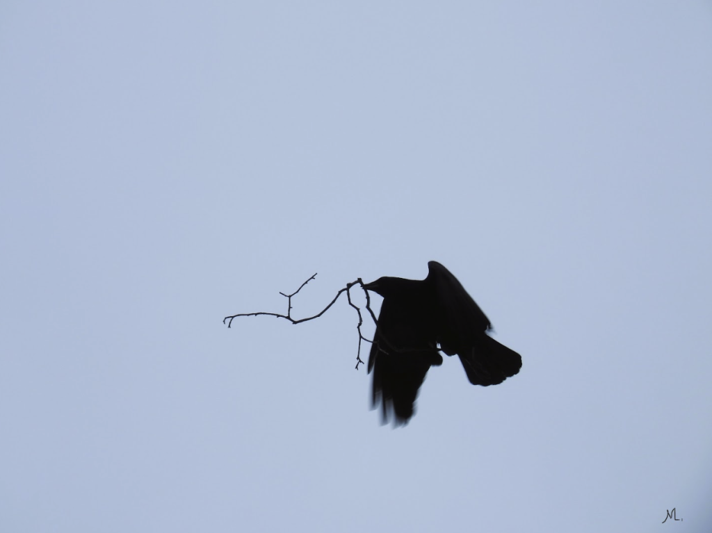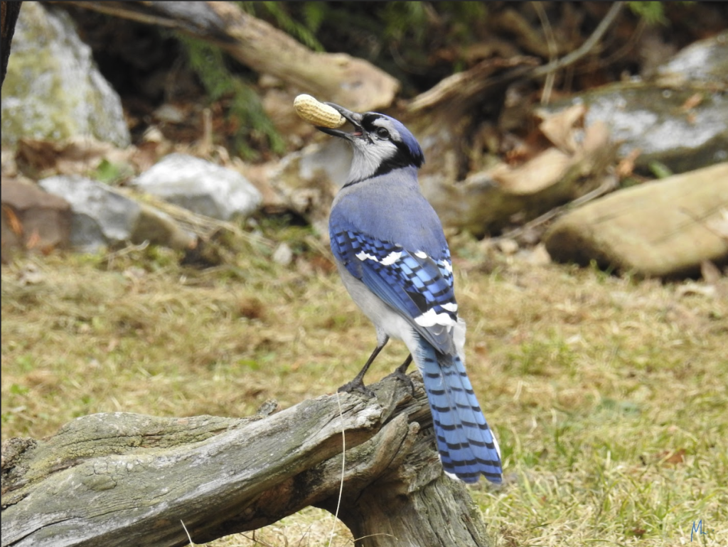 En face de chez moi, un couple de corneilles d’Amérique construit son nid dans le grand sapin de 30 mètres de haut. En image, le mâle tient une branche à son bec qu’il a empruntée de l’immense érable dans notre cour arrière. Le geai bleu, quant à lui, semble bien fier en montrant son arachide bien en vue dans son bec.