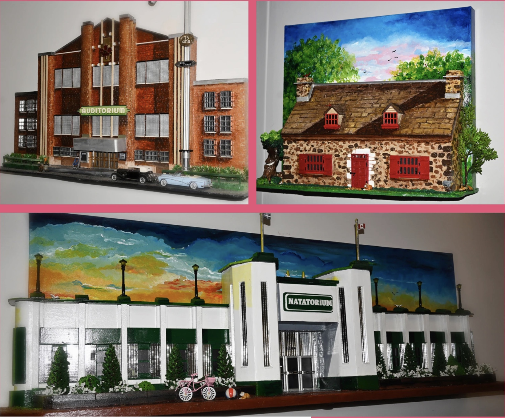Jocelyne Ménard, une fonctionnaire qui a pris sa retraite il y a 16 ans, et qui s’est lancée avec passion dans le bricolage de façades de maison sans s’imaginer l’importance que ce hobby à l’origine, prendra dans sa vie. Devenue un travail presque à temps plein dans son atelier qui occupe beaucoup d’espace chez elle, la production de ces tableaux perpétue le souvenir d’immeubles et de rues de nos quartiers. Jocelyne Ménard fait revivre un patrimoine disparu ou menacé de disparaître. C’est là sa principale préoccupation. La reproduction du Natatorium et de la Maison Saint-Dizier démontre que Jocelyne Ménard est attentive au patrimoine présent dans nos rues.