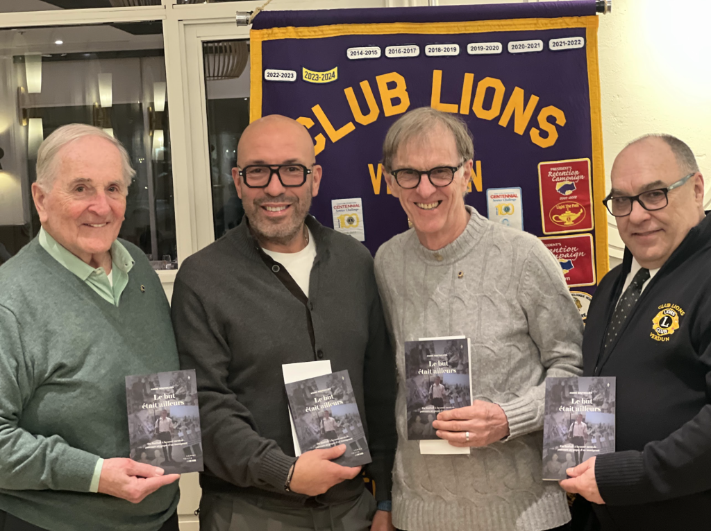 Le Grand Verdunois, André Bouthillier qui est aussi vice-président exécutif du Cabinet de relations publiques National, nous raconte, dans son livre Le but est ailleurs, la trajectoire hors du commun d’Amine Sâadi : celle d’un homme qui a tout risqué pour se reconstruire, sans jamais perdre sa passion, ni sa dignité. Tous les deux étaient conférenciers récemment lors d’un souper du Club Lions Verdun. Ils sont en compagnie de Georges Bossé et du président du Club, Daniel Thériault.