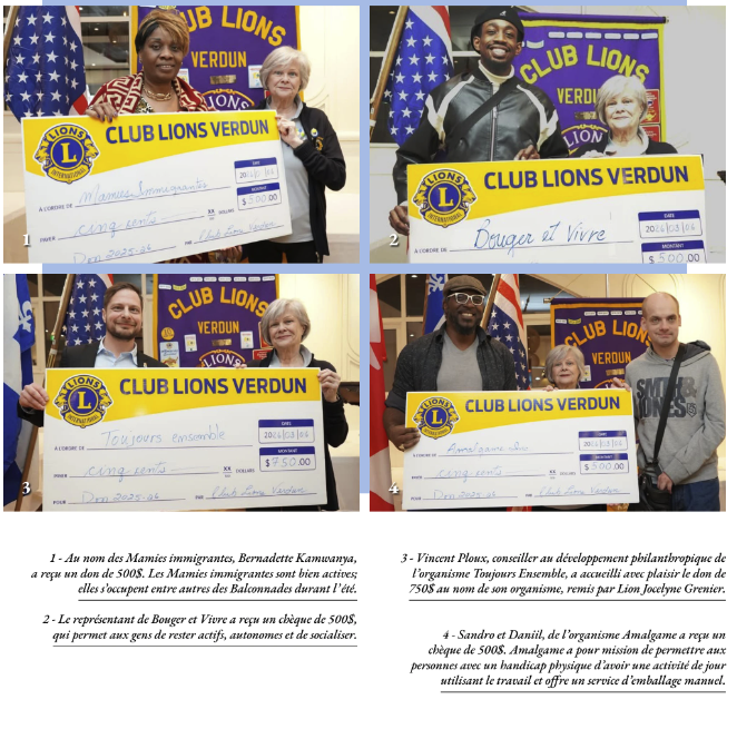 Ces contributions financières permettront de soutenir la poursuite de leurs activités et d’offrir des services adaptés aux besoins grandissants de la population. Pour le Club Lions de Verdun, il s’agit d’un geste qui s’inscrit dans une longue tradition de générosité et d’implication locale.