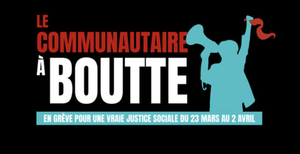 Résultat : le milieu communautaire est à boutte! Il est en lutte pour la survie du filet social québécois et refuse de se taire, bien au contraire, il passe à l’action sur la place publique. Voilà le contexte dans lequel est né le mouvement Le communautaire à boutte, un collectif qui regroupe plus de 1000 organismes étalés aux quatre coins du Québec, et qui exige la reconnaissance, le financement adéquat et le respect des travailleurs. Le mouvement prendra la forme d’une semaine de grève des organismes communautaires à travers le Québec, du 23 mars au 2 avril.