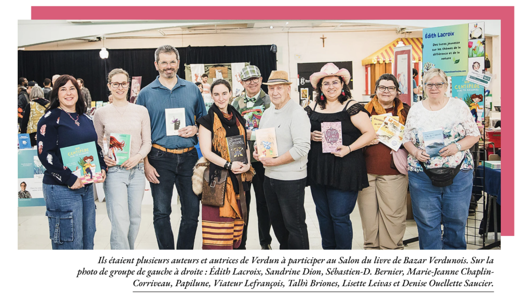 Sept auteurs et autrices de l’arrondissement y étaient. Des écrivains et écrivaines comme Édith Lacroix, Sandrine Dionne-Gougeon, Sébastien-D Bernier, Marie-Jeanne Chaplin-Corriveau, Papilune et Talhì Briones, ainsi que des artistes comme Lisette Leivas et Denise Ouellette, témoignent une fois de plus de l’abondance de talents dans l’arrondissement de Verdun/Île-des-Sœurs.