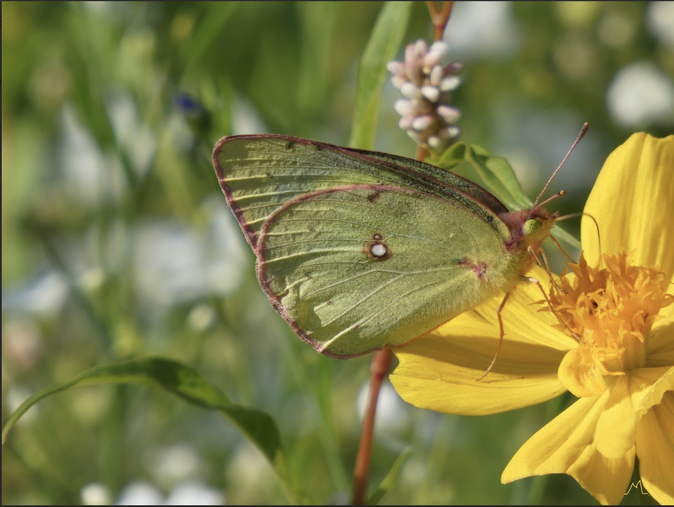 Du mois d’avril au mois d’octobre, le papillon souci voltige de fleur en fleur dans les prairies, les terres en friche, les bordures de routes, dans nos parcs et finalement partout où il fait chaud. Il n’aime pas l’humidité ni les marécages, le souci est un papillon estival. J’ai déniché ce spécimen en bordure de la piste cyclable longeant l’aqueduc de Montréal. À Verdun, les jardins de plantes indigènes en arrière de la maison tricentenaire Nivard-de-Saint-Dizier, sont d’autres endroits que je visite régulièrement pour ses variétés de papillons.