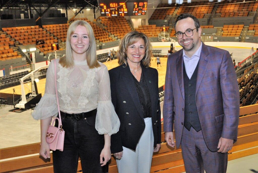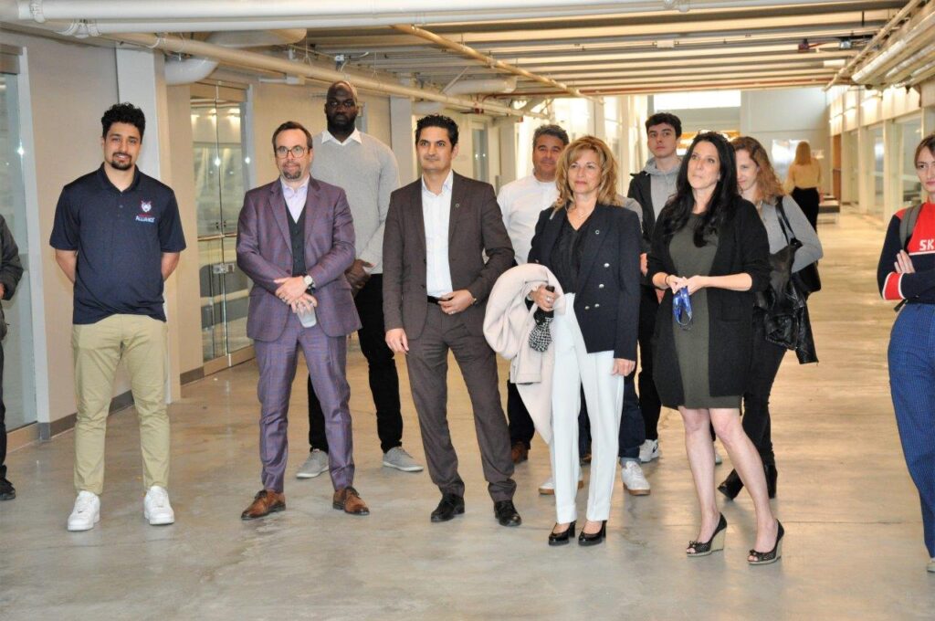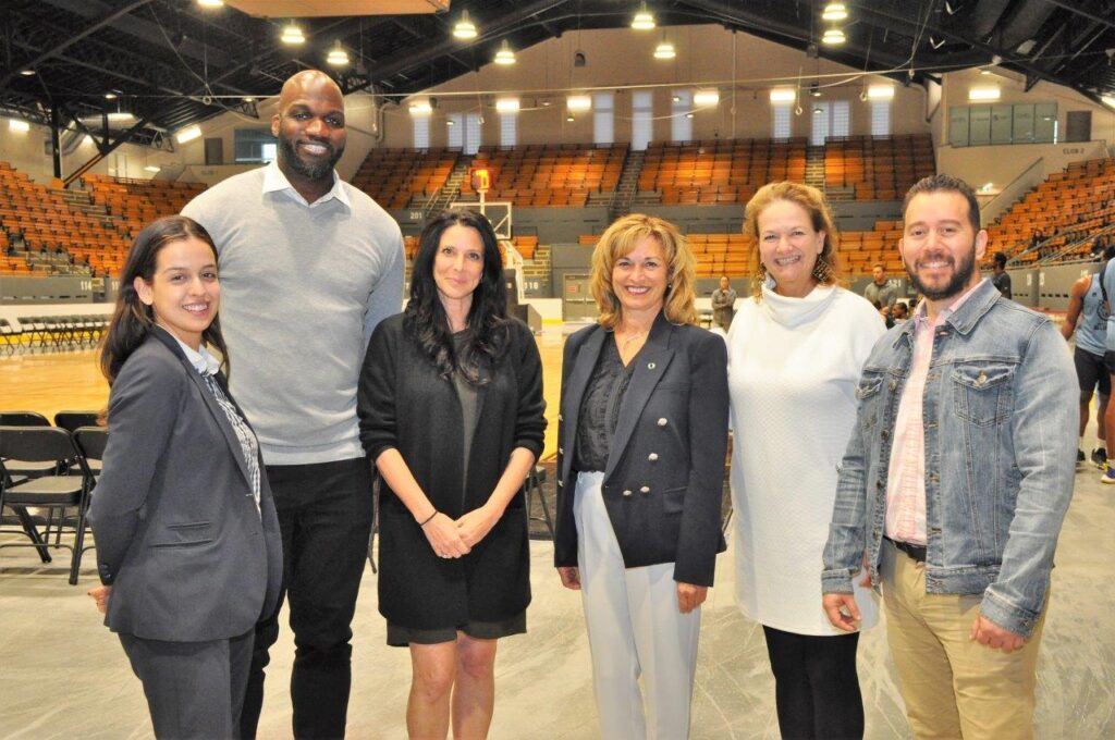 Lors de l’événement Hors-Série organisé par le Réseau Affaires Verdun, de gauche à droite, Kaïla Munro, conseillère d’arrondissement de Verdun, Joël Anthony, directeur général et Annie Larouche, vice-présidente et directrice des opérations de l’Alliance de Montréal, Marie-France Boyer, présidente du Réseau Affaires Verdun et directrice générale de la caisse Desjardins Île-des-Soeurs-Verdun, Véronique Tremblay, conseillère de ville et Enrique Machado, conseiller d’arrondissement de Verdun étaient visiblement heureux(euses) de se retrouver sur le terrain même de l’équipe de la Ligue Canadienne Élite de Basketball (CEBL) ,l’Alliance de Montréal.