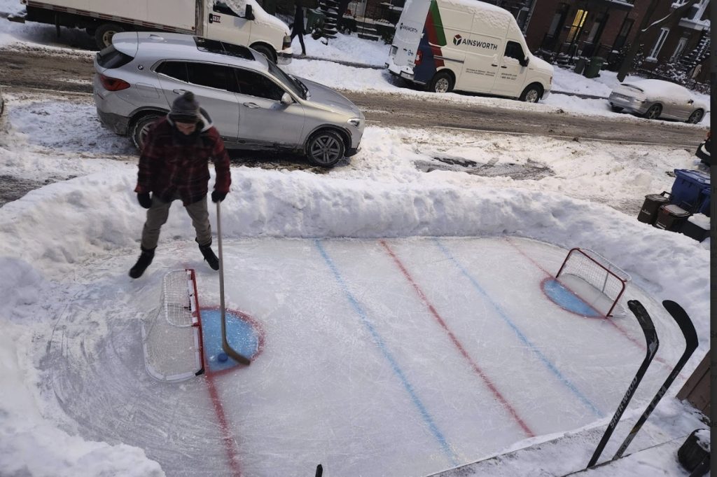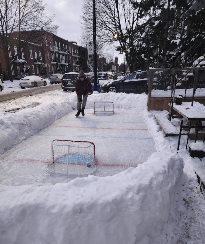 Il faut dire qu’il ne fait pas les choses à moitié, ce M. Socha. Sa petite patinoire est lignée, comme la patinoire du Centre Bell, et deux mini-filets complètent le tableau. Une table de pique-nique est installée sur un côté, en guise de gradin. Il ne manque que le logo du Canadien de Montréal au centre.