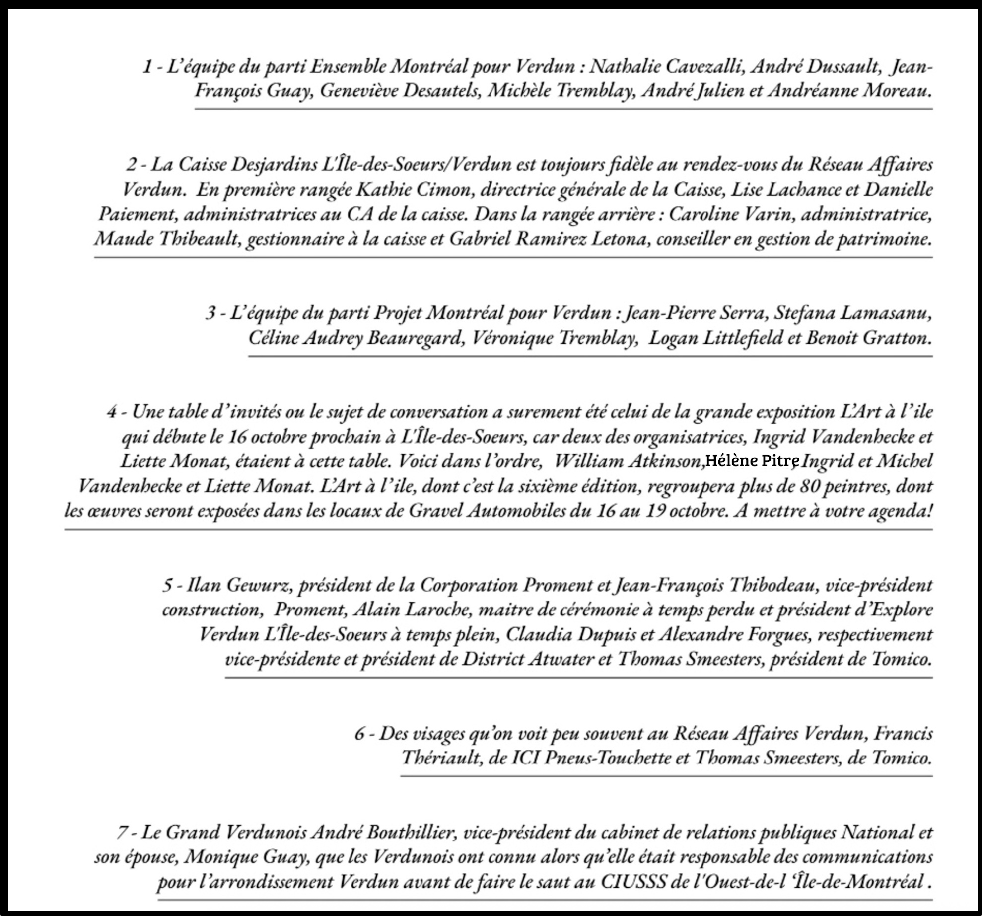 S’y trouvaient aussi, parmi plusieurs autres, la candidate à la mairie de Verdun pour Ensemble Montréal, Geneviève Desautels, la conseillère de ville sortante, Véronique Tremblay (Projet Montréal), de même que les candidates verdunoises Andréanne Moreau et Michèle Tremblay et le candidat Jean-François Guay, tous trois d’Ensemble Montréal.