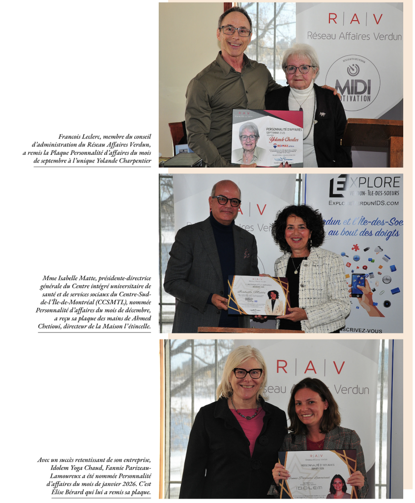 Notons que le premier Midi-motivation 2026 du Réseau Affaires Verdun, en ce 19 février, animé par Kathie Cimon a été l’occasion de remettre des plaques honorifiques à trois femmes méritantes, désignées personnalités des mois de septembre, décembre et janvier.