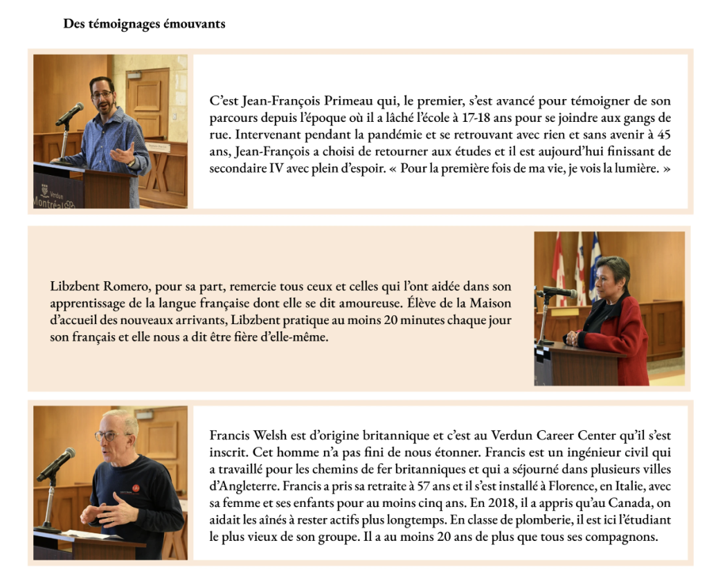Le conseiller d’arrondissement Benoit Gratton a affirmé pour sa part qu’il suivait depuis plusieurs années la journée des apprenants et qu’il trouvait l’événement touchant et qu’il était rempli d’admiration pour ces adultes en formation. M. Gratton a noté la présence de ses collègues André Julien et Michèle Tremblay à cette rencontre. Notez que le directeur du CJE était épaulé par une animatrice du secteur anglophone, Safak Eran-Tasker, que nous saluons.